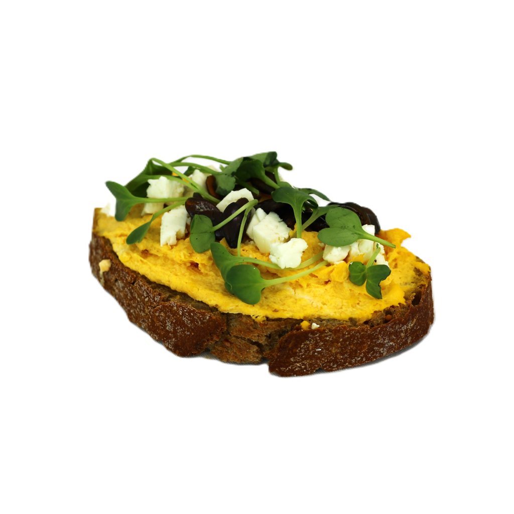Složení: pomazánka dýňová, bezlepkový chléb, balkánský sýr, výhonky, dýňová semínka