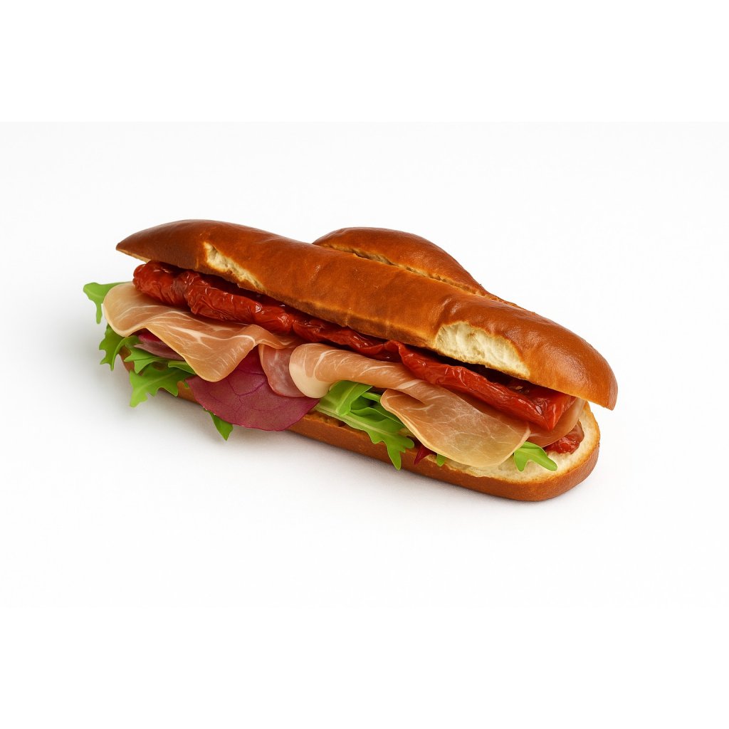 Složení: pomazánkové máslo, louhovaný rohlík, parmská šunka, rajčata, rukola