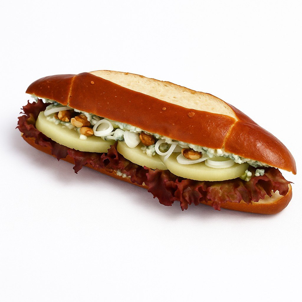 Složení: pomazánka ze sýra s modrou plísní, brusinková zavařenina, louhovaný rohlík, salát